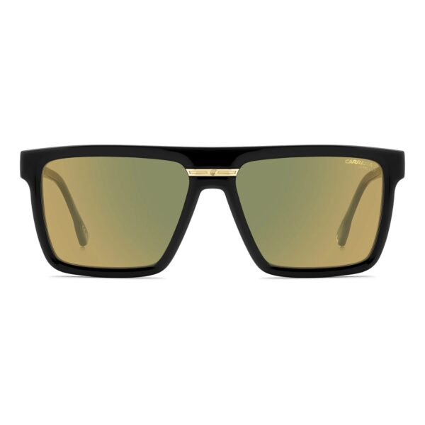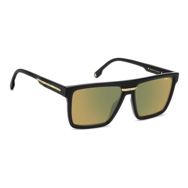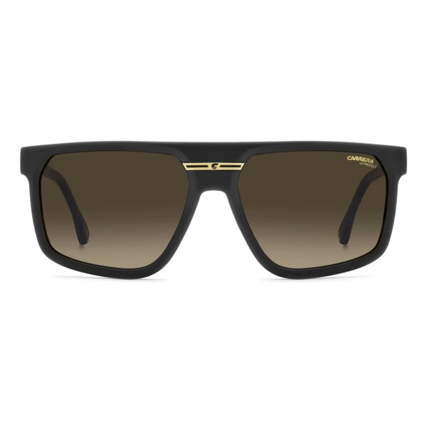 The Carrera VICTORY C 03/S 003/86 sunglasses feature a bold flat-top rectangular frame in matte black, crafted with eco-polyamide for strength and style. These Made in Italy sunglasses exemplify precision design from Carrera, including the flag plaque and horizontal “C” detail on the temples.